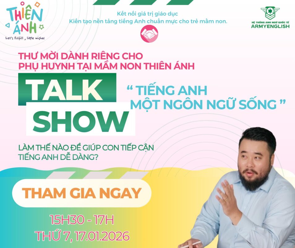 Army English phối hợp cùng Nhà trường Thiên Ánh trân trọng kính mời ba mẹ tham gia Talkshow chia sẻ dành cho Phụ huynh mầm non với chủ đề giúp con tiếp cận Tiếng Anh dễ dàng ngay từ sớm.