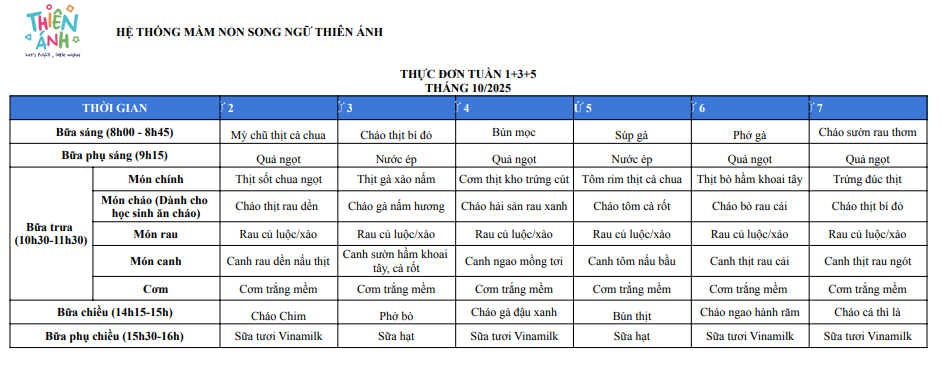 Dinh dưỡng, Tin tứcThực đơn tuần 1+3+5 tháng 10/2025 Posted on 26 Tháng 10, 202526 Tháng 10, 2025 by btv_thienanh Thực đơn 2025 – Tuần 1,3,5 tháng 10 btv_thienanh Trường Mầm non Thiên Ánh trang bị thêm học cụ mới