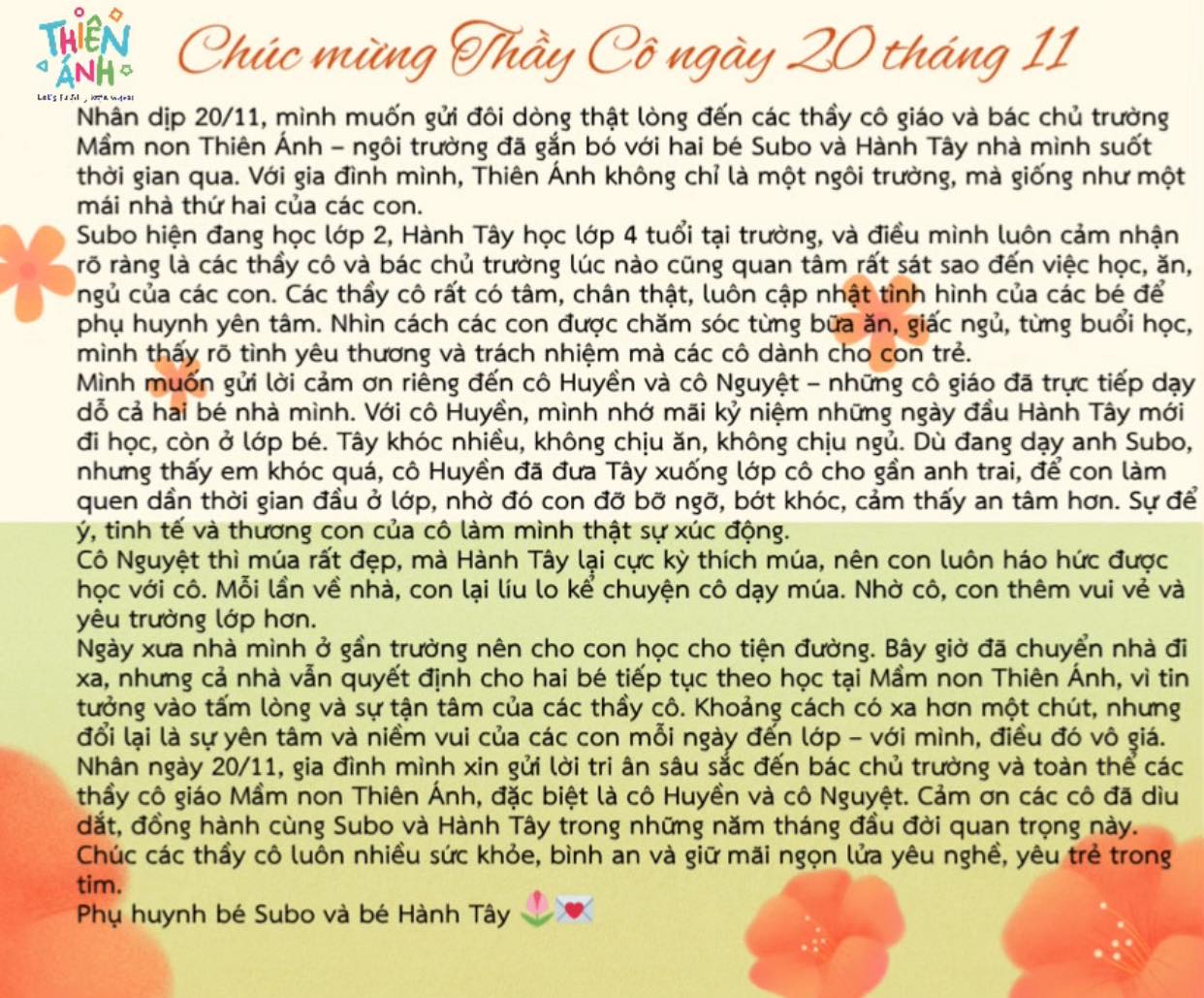 Cuộc thi “Lan tỏa yêu thương cô và trò” chào mừng Ngày Nhà giáo Việt Nam 20/11 đã khép lại sau hành trình đầy cảm xúc với sự tham gia nhiệt tình của quý phụ huynh và các con.Bên cạnh những bài dự thi đạt giải, Ban tổ chức xin được trân trọng giới thiệu các tác phẩm dự thi còn lại – tuy không nằm trong danh sách nhận giải thưởng nhưng vẫn chứa đựng những giá trị yêu thương sâu
