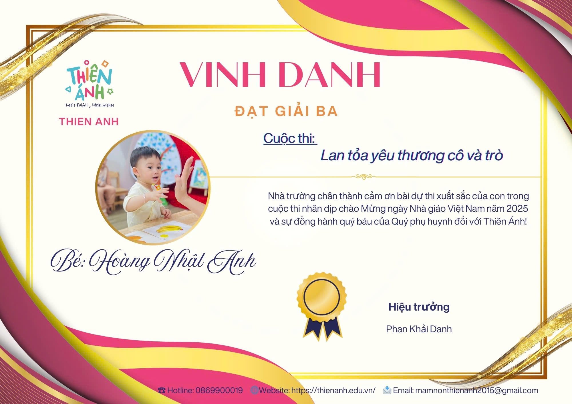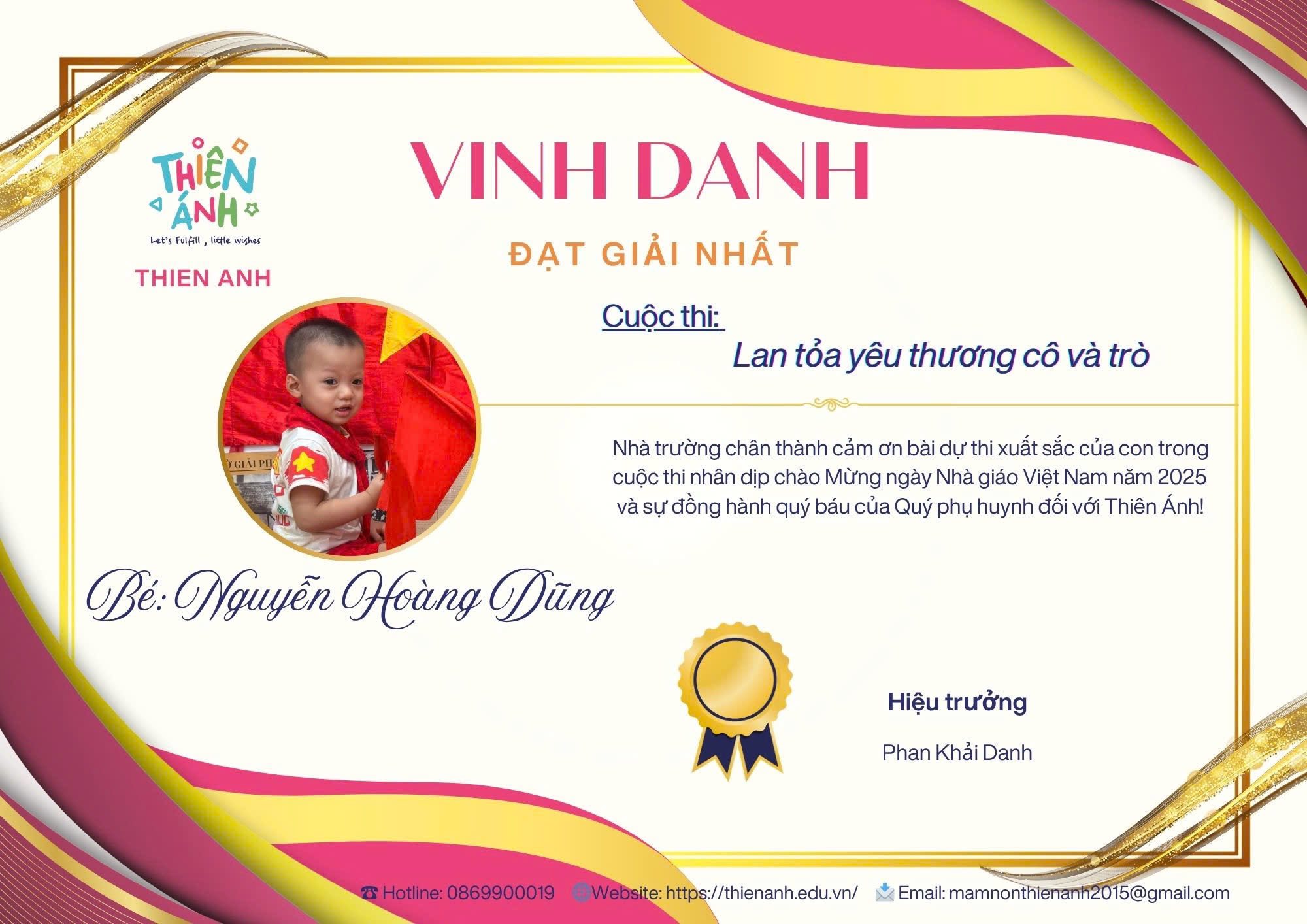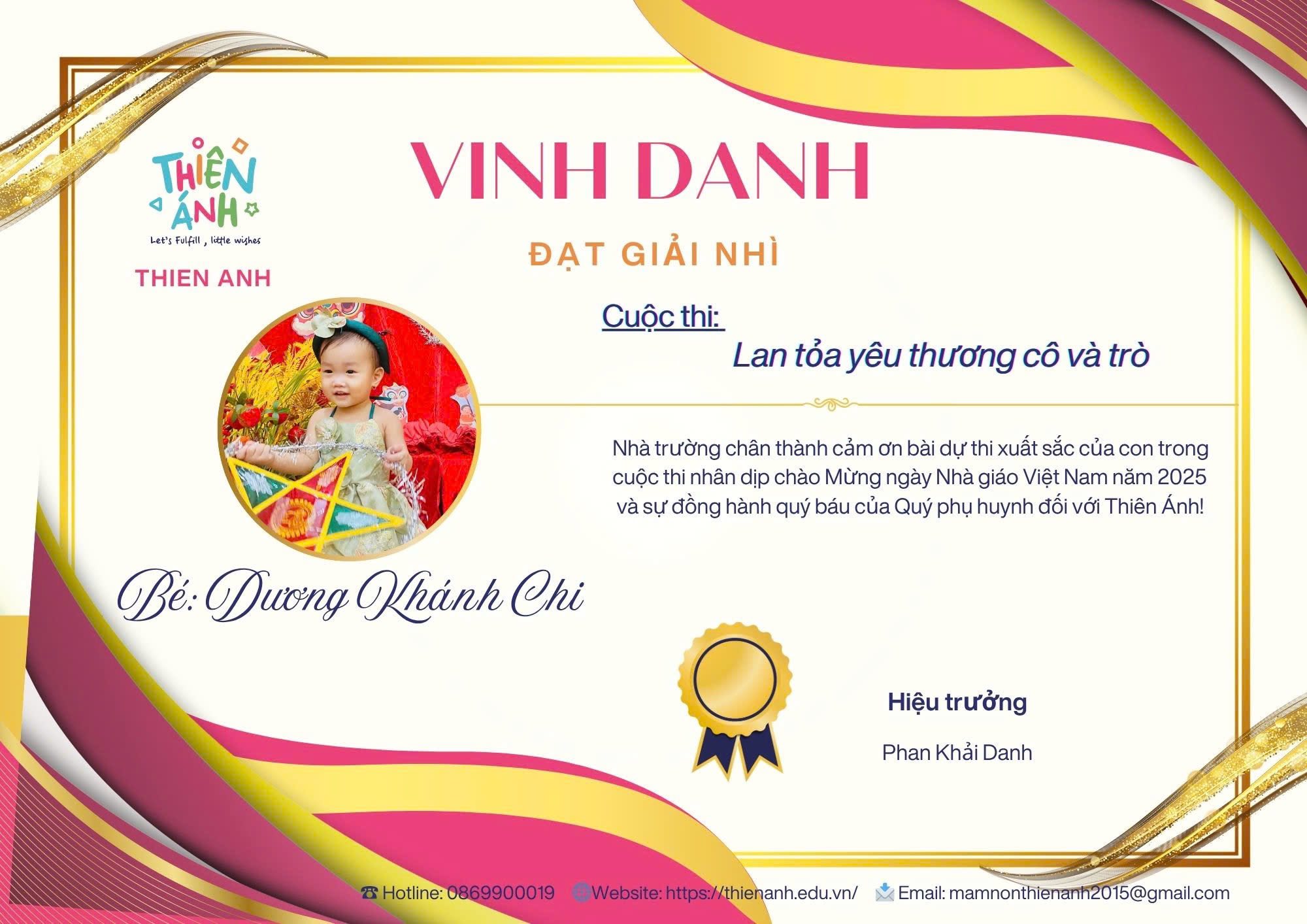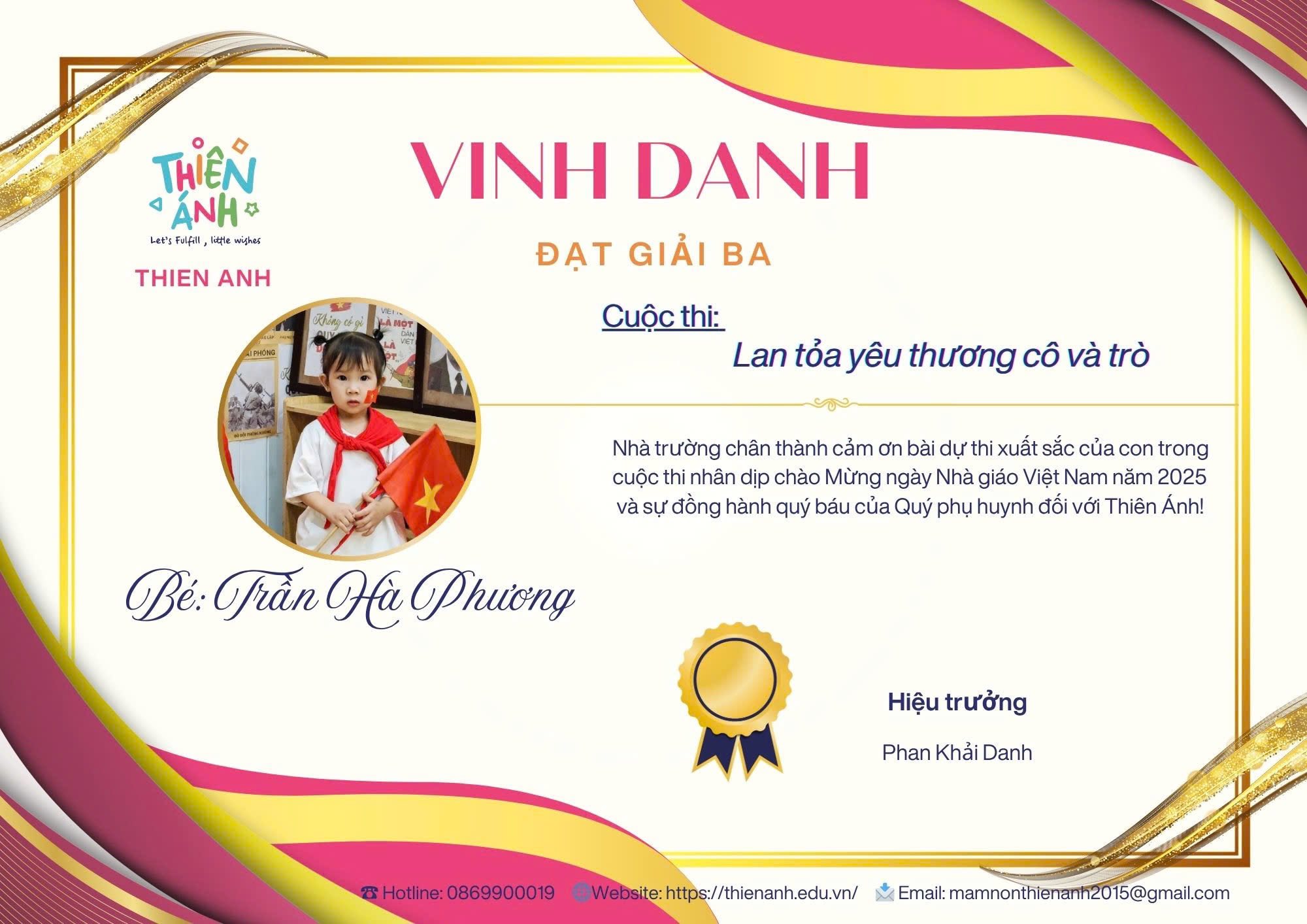 Lời bài dự thi: “Người ta nói, tuổi thơ của một đứa trẻ là một cánh diều, và những người thầy, người cô chính là ngọn gió nâng cánh diều ấy bay cao trên bầu trời ước mơ Ngôi trường Mầm Non Thiên Ánh chính là nơi bắt đầu hành trình ấy, nơi con trẻ không chỉ học những bài học đầu đời, mà còn được yêu thương, vỗ về và chắp cánh ước mơ từ những đôi bàn tay dịu dàng của các cô. Từng giờ học, từng trò chơi, từng vòng tay ôm ấp… đều chất chứa biết bao tình cảm và tâm huyết. Với các con, những trò chơi, những cử chỉ ấy như lá chắn đánh bay nỗi sợ trong con. Để rồi mỗi ngày tới trường, tới lớp con lại dạn dĩ hơn biết bao nhiêu, tiếng cười hòa vang như 1 bản nhạc hạnh phúc. Cảm ơn các thầy, các cô! Những người đã âm thầm yêu thương và ươm mầm những bông hoa đầu đời!. Nhân dịp 20/11 – Ngày Nhà Giáo Việt Nam, xin gửi lời tri ân sâu sắc đến những người thầy, người cô. Kính chúc các thầy cô trường Mầm Non Thiên Ánh luôn mạnh khỏe và tràn đầy nhiệt huyết.”
